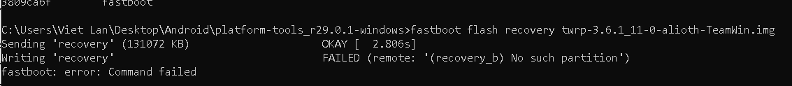 Thanks for sharing another version of TWRP. I tried but unsuccessfully. It says "FAILED (remote: '(recovery_b) No such partition')"